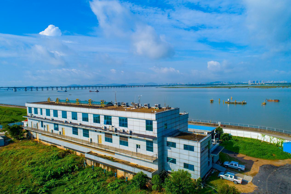 廣昌泵站位于西江磨刀門水道珠海大橋上游,占地面積71畝,共有一、二期兩座泵房,泵站采用河心式取水方式,總?cè)∷芰?30萬(wàn)立方米/日。每年豐水期(汛期)廣昌泵站是珠海東部以及澳門的主力取水泵站,而枯水期(咸期)則主要作為珠海原水供應(yīng)系統(tǒng)中“西水東調(diào)來(lái)水”(上游平崗泵站、竹洲頭泵站或竹銀水庫(kù)來(lái)水)的中途轉(zhuǎn)輸水泵站,是珠海和澳門原水供應(yīng)系統(tǒng)中重要的樞紐泵站。