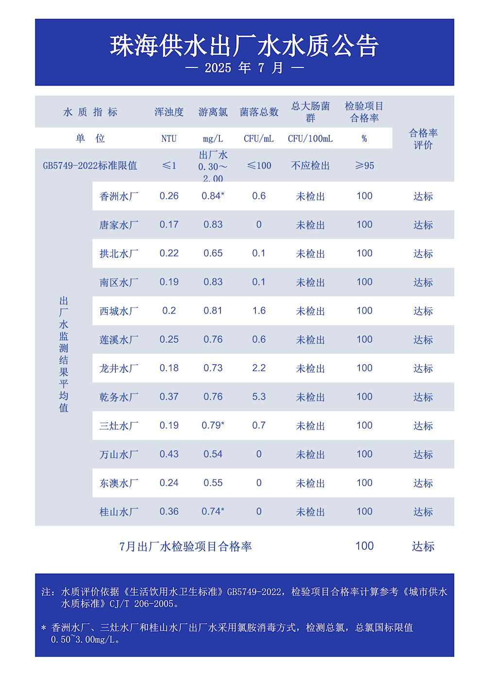 2025年7月珠海供水出廠水水質(zhì)公告 發(fā)布時間:2025年08月13日 瀏覽次數(shù): 次 小大 原文下載: 2025年7月珠海供水出廠水水質(zhì)公告.doc 【打印正文】
