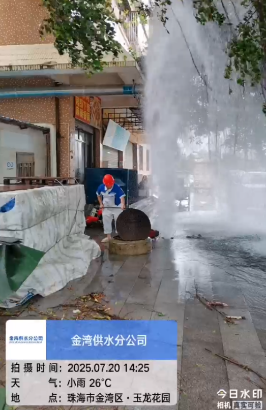 7月20日下午,金灣文華路11號的消火栓被強風刮倒的大樹撞斷,3米高的水柱在狂風中噴涌。接到消息后,搶修人員立即穿著被雨水浸透的工作服匆匆趕到,參與搶險的黃師傅回憶道,“當時風雨未停,但看到噴涌的水柱,就顧不上那么多了?!贝舜螕岆U僅用30分鐘處理完畢,無用戶受影響,創(chuàng)造了臺風天氣搶修新速度。